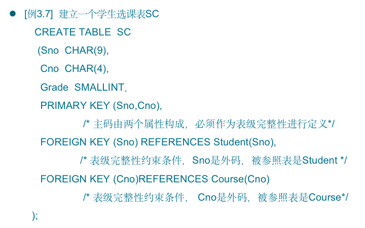 CREATE TABLE <表名> (<列名> <数据类型>[ <列级完整性约束条件> ] [,<列名> <数据类型>[ <列级完整性约束条件>] ] … [,<表级完整性约束条件> ] )
