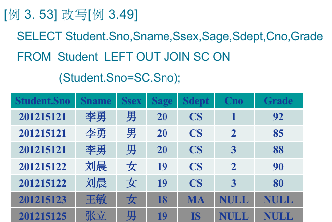 - 再和Student中满足连接条件的元组进行连接得到最终的结果关系