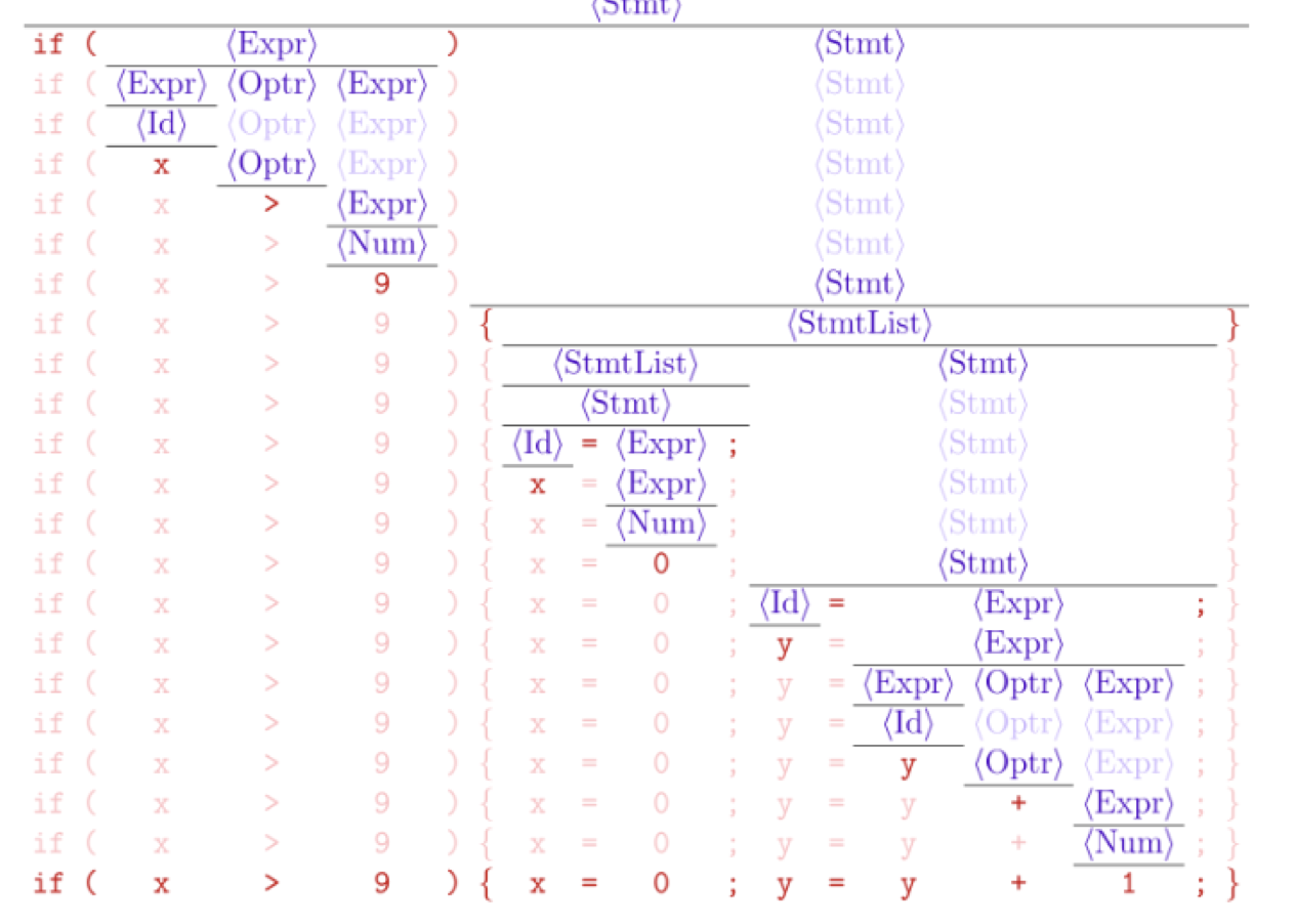 每个中间节点表示对某个非终结符应用某个产生式进行推导