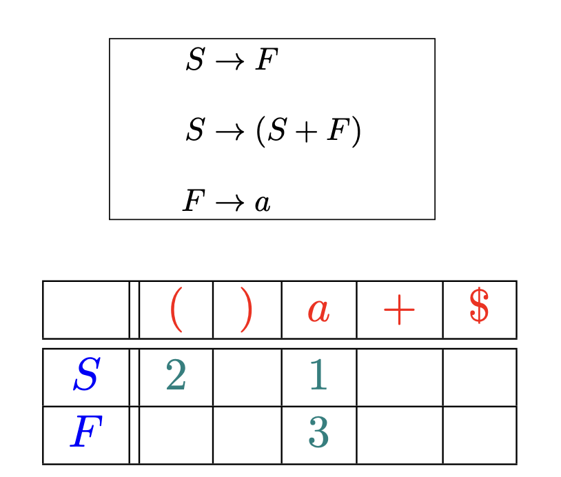该选择哪个产生式 (按编号进行索引) 或者报错 (空单元格)