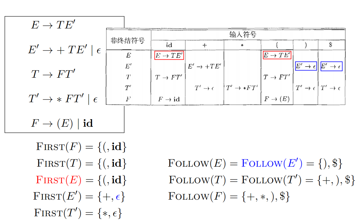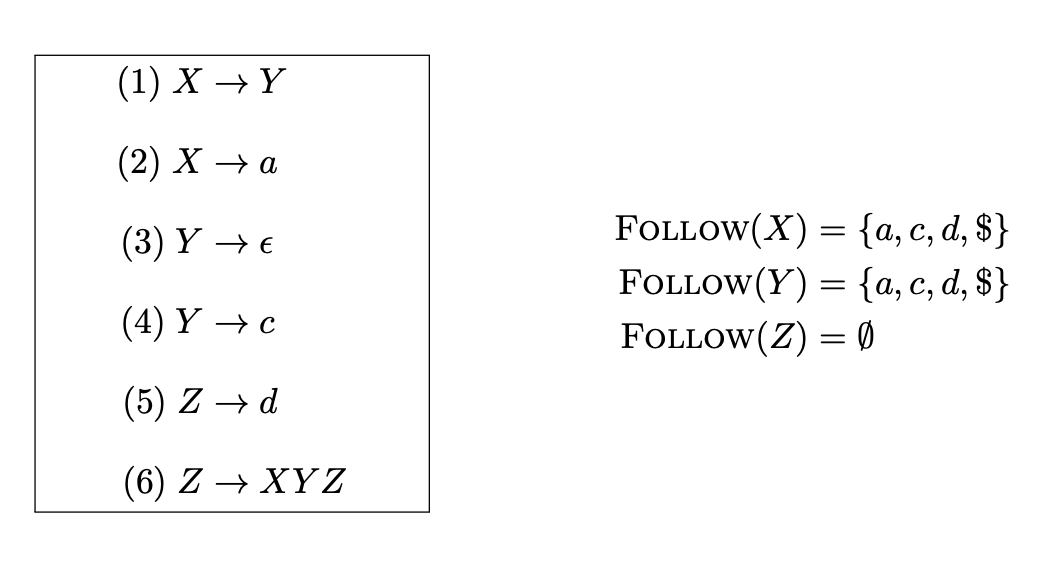 考虑产生式$A \to \alpha$,如果从$\alpha$可能推导出空串($\alpha \stackrel{\mathrm{*}}{\Rightarrow} \epsilon$),则只有当当前词法单元$t \in FOLLOW(A) $,才可以选择该产生式